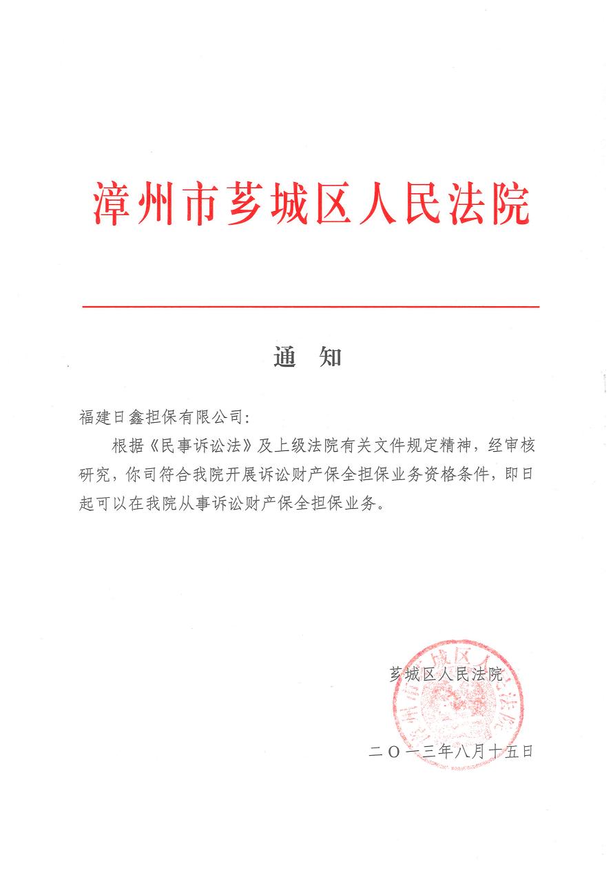 福建日鑫擔保有限公司在漳州市薌城區(qū)人民法院開展訴訟財產(chǎn)保全擔保業(yè)務的核準通知文件